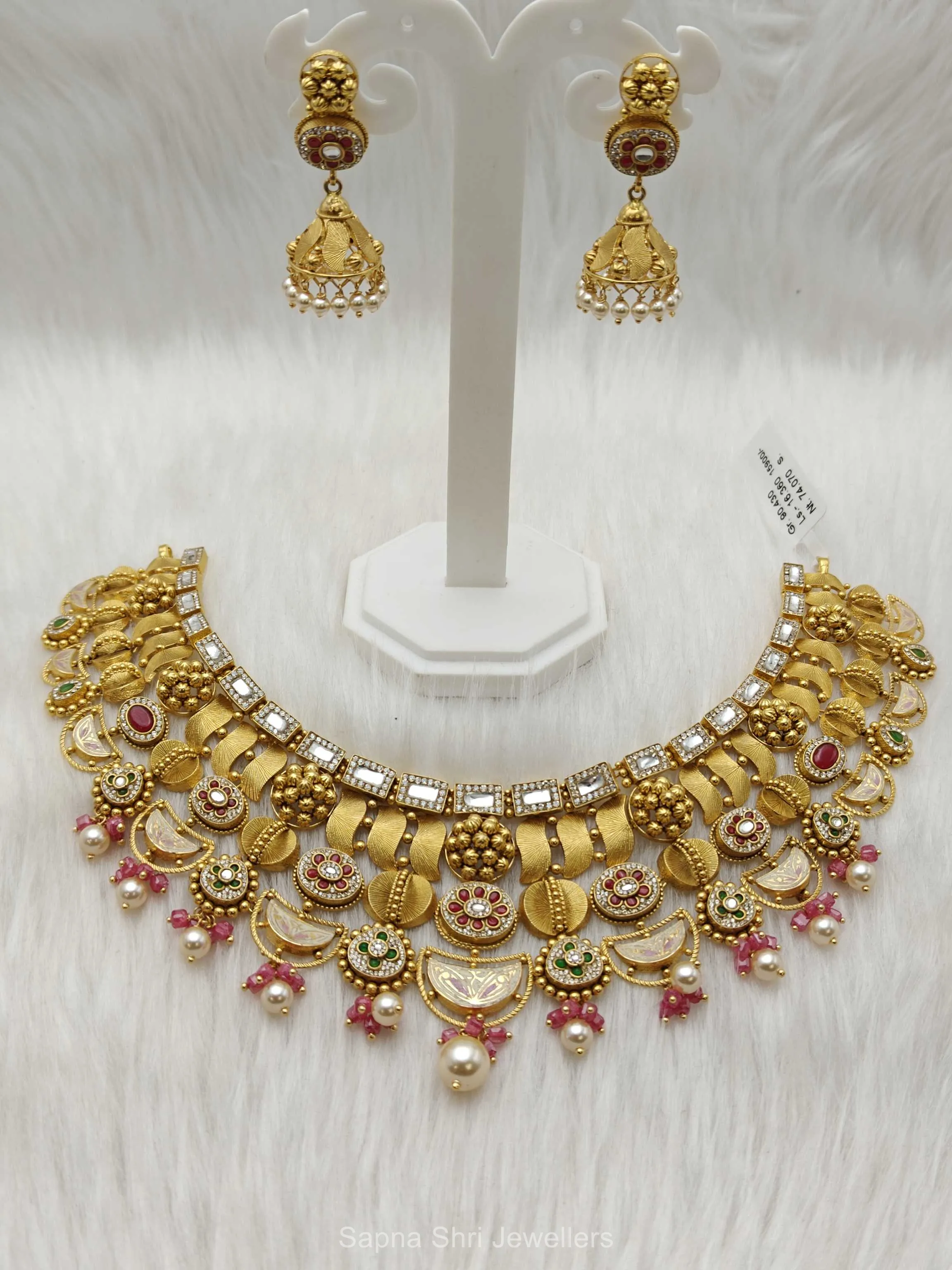 BIS HallmarkThis antique gold necklace features a bold circular pendant with intricate matte finish and Kundan detailing. A regal choice for traditional festivities and bridal elegance.
