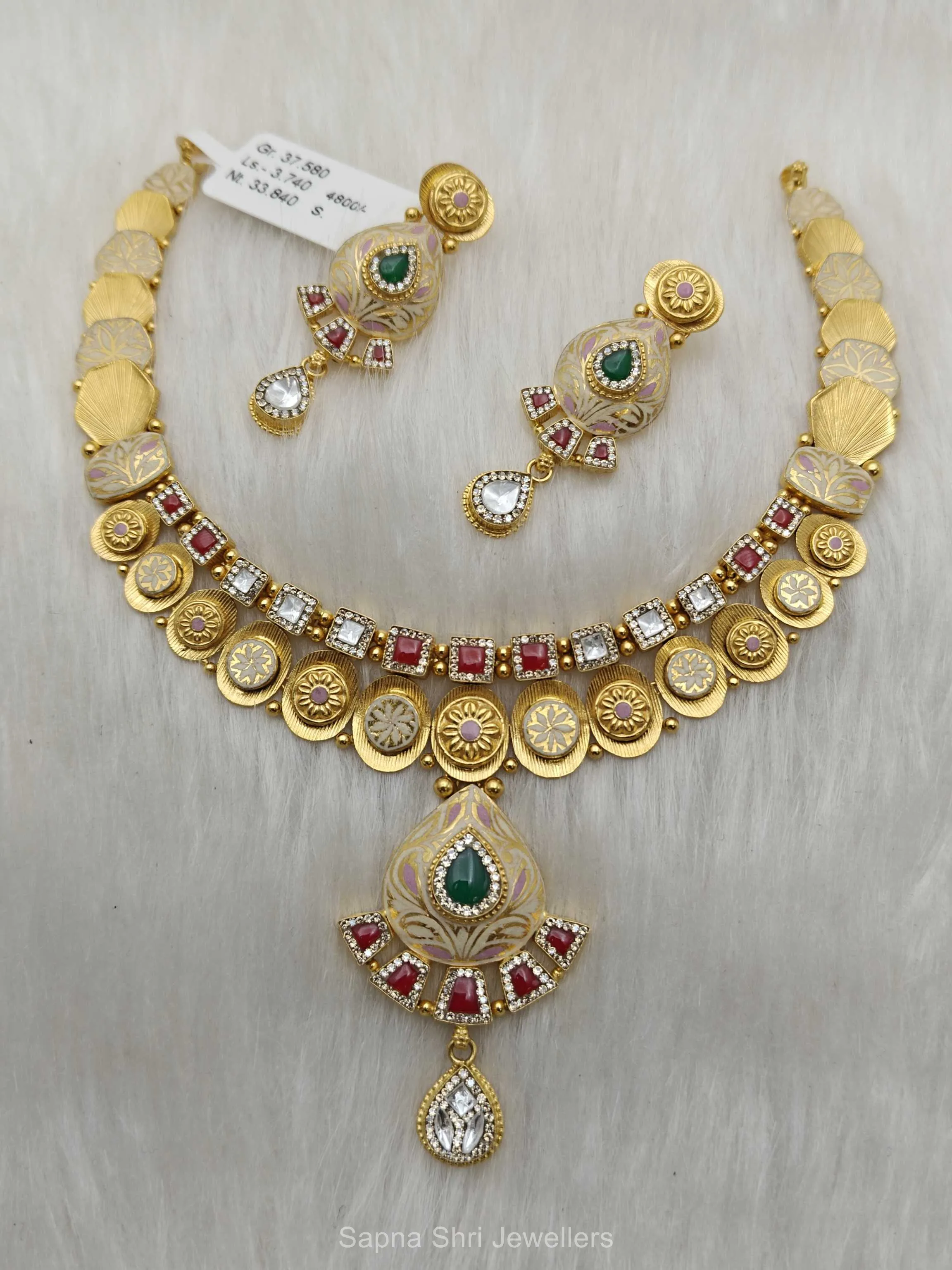 BIS HallmarkA focal triangular pendant with intricate meenakari and kundan work defines this set. The floral motifs along the chain add a graceful touch to this traditional ethnic ensemble.