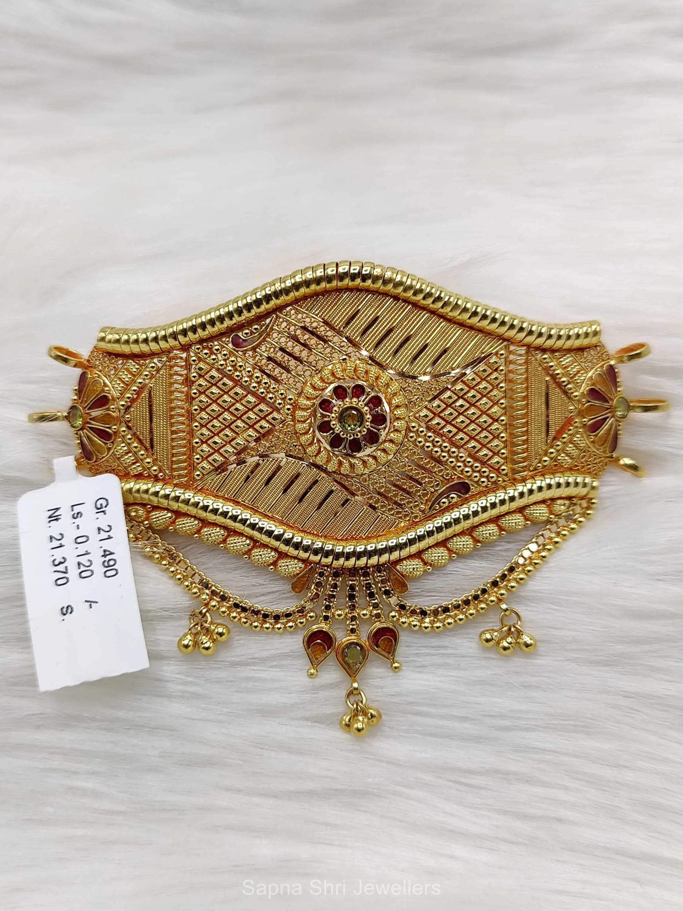 BIS HallmarkBeautiful gold Bajuband with fine craftsmanship, a flower design, and decorated with small hanging tassels and beads, perfect for traditional Indian attire.