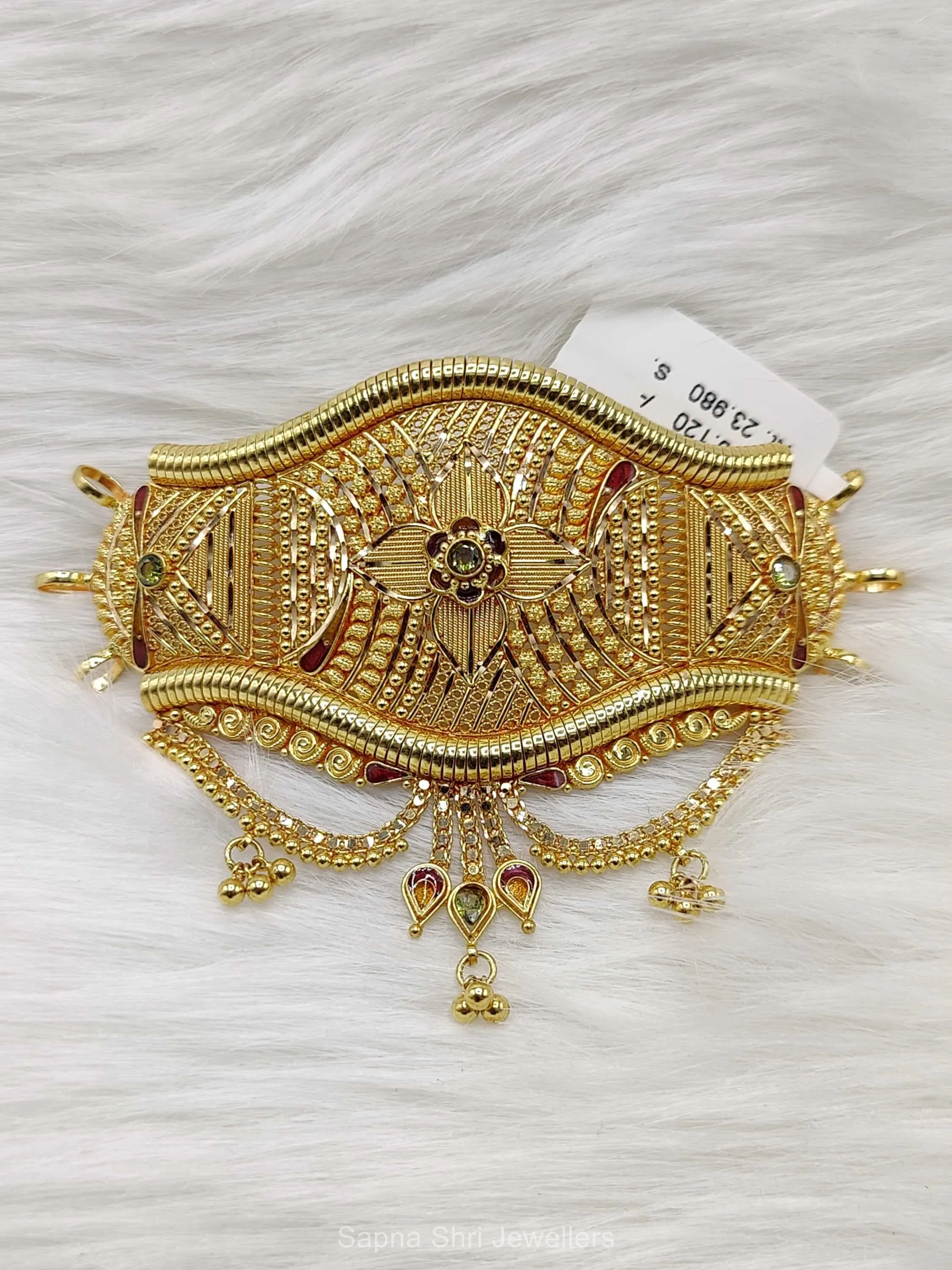 BIS HallmarkVery beautiful gold Bajuband with geometric and traditional intricate carving, featuring charming tassels, excellent for special occasions.