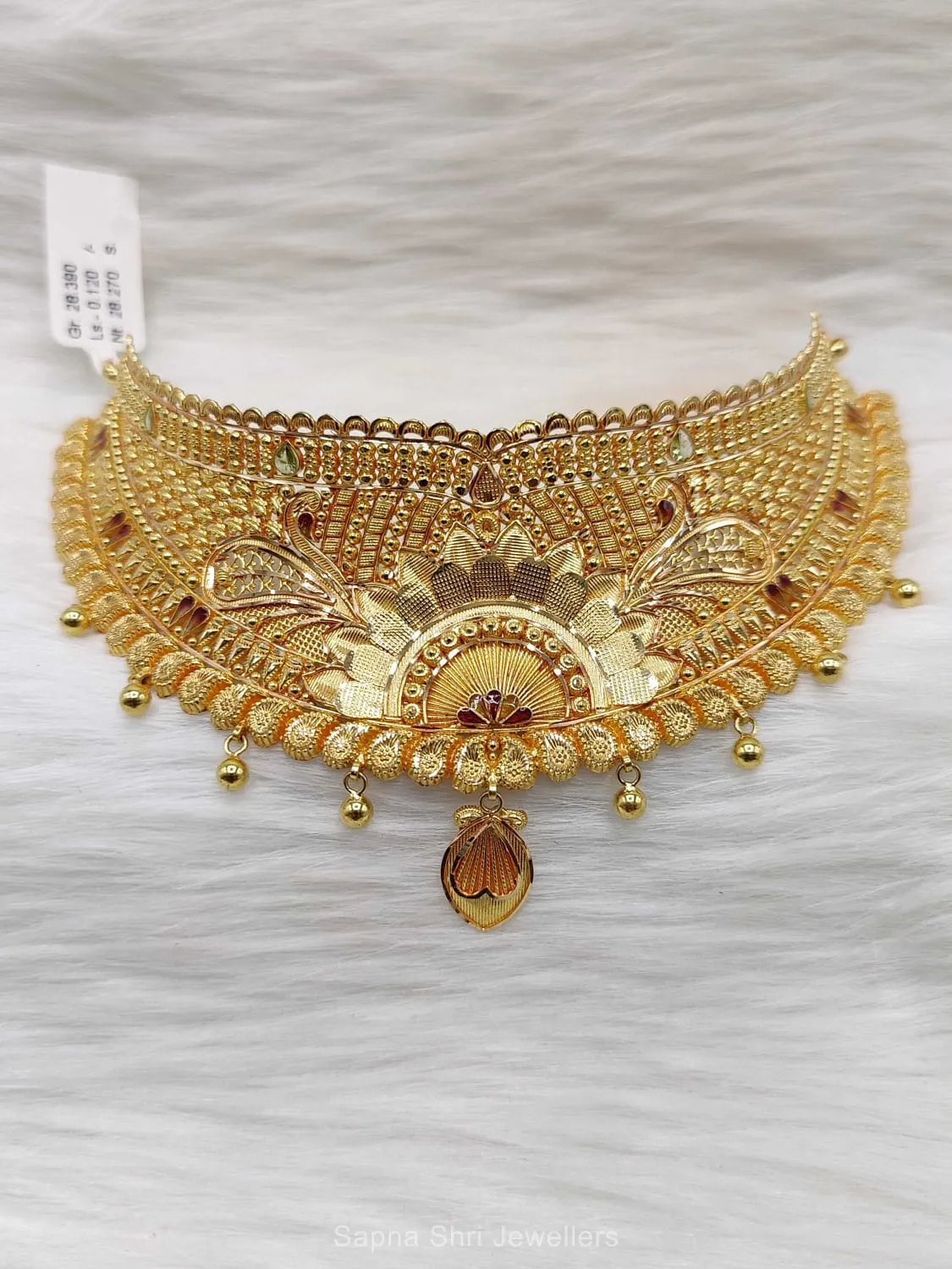 BIS HallmarkRadiant sunburst patterns meet delicate filigree in this heritage-inspired choker, finished with a classic leaf-style drop and gold ghungroos.