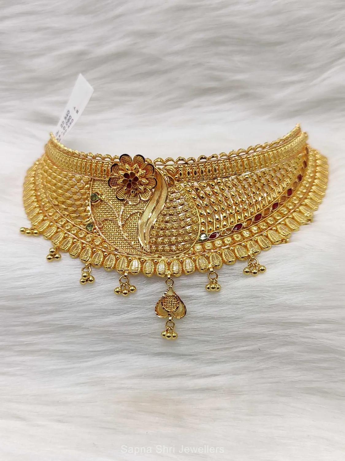 BIS HallmarkFeaturing a stunning paisley-inspired curved motif, this gold choker represents the pinnacle of traditional artistry. The cascading gold beads add a graceful movement to the design.