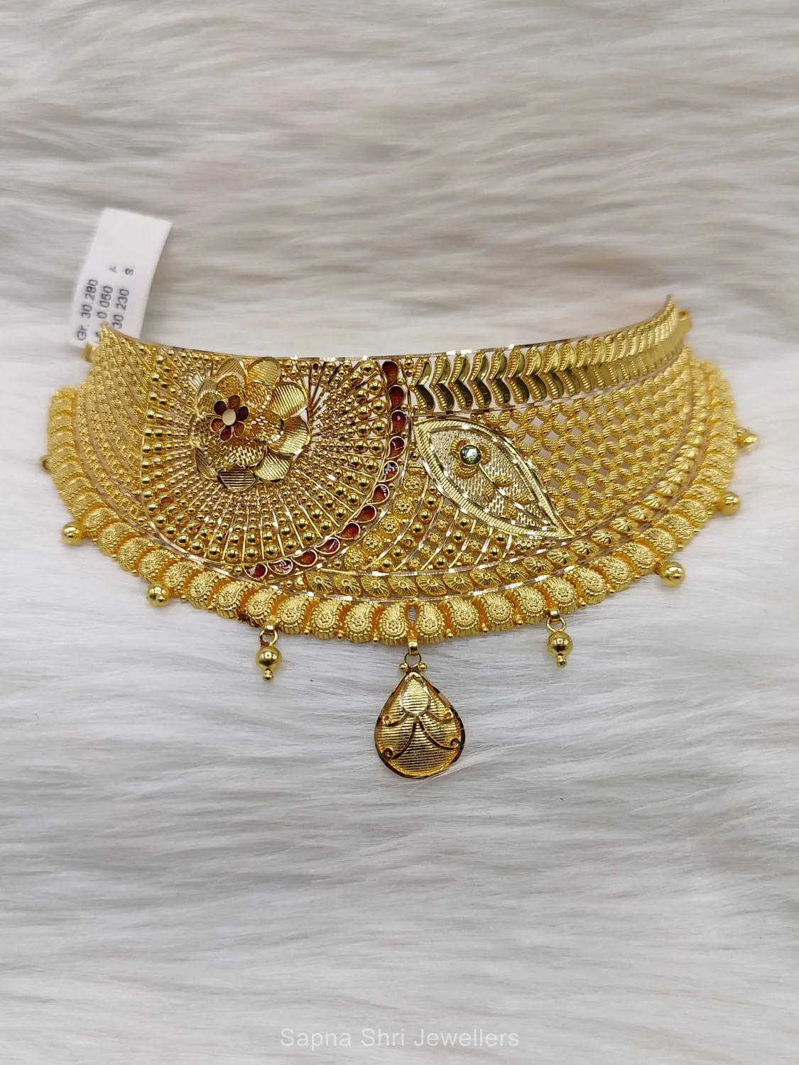 BIS HallmarkA sophisticated gold choker showcasing a unique asymmetric sunburst pattern and leaf motifs. Handcrafted with precision to offer a regal touch to your traditional wedding attire.