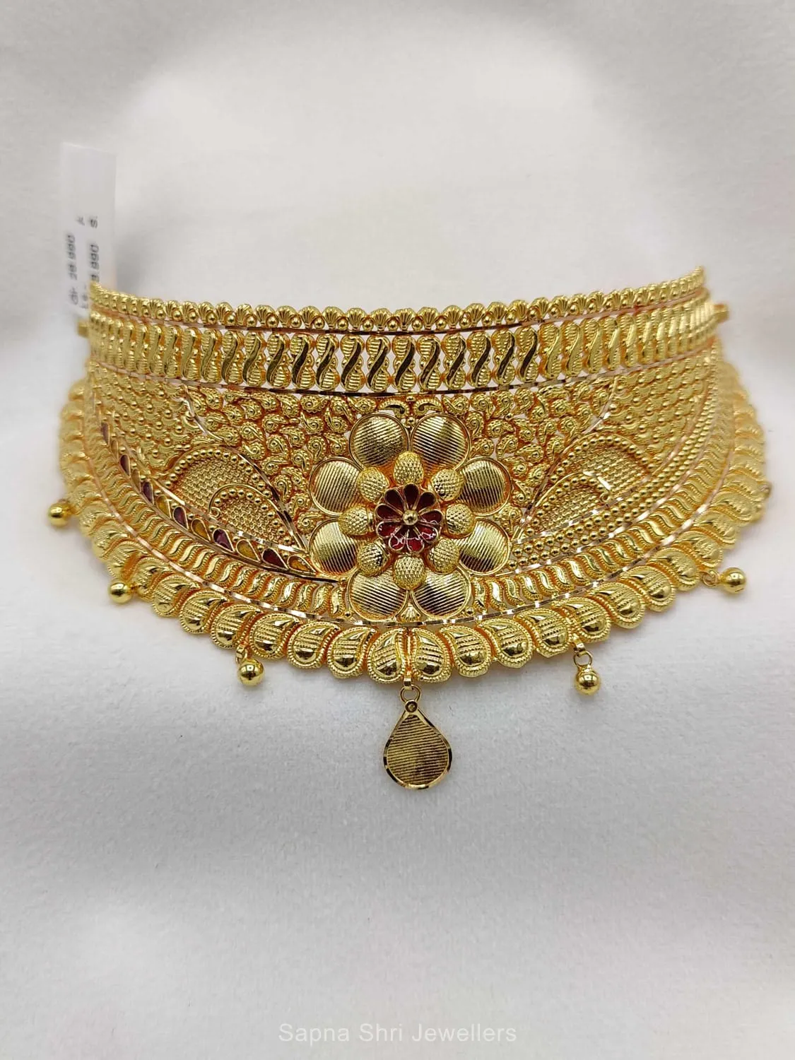 BIS HallmarkA heavy gold choker showcasing a magnificent lotus-inspired center and swirling filigree. Expertly crafted to provide a bold and royal statement for high-profile weddings.