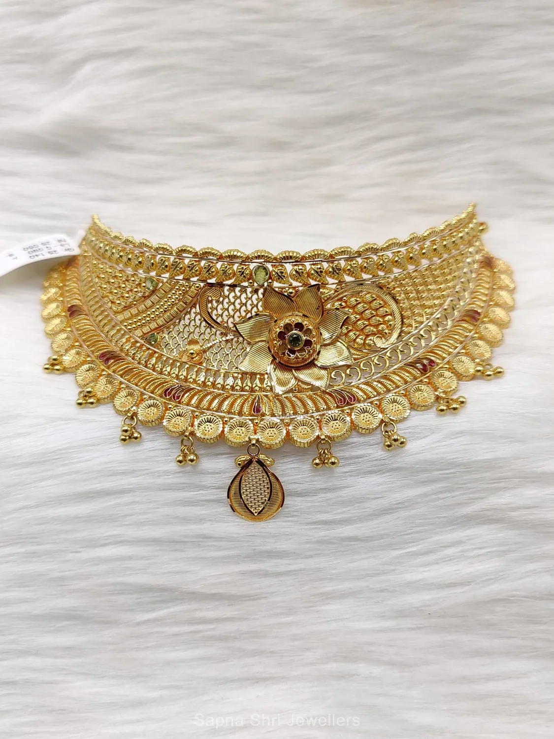BIS HallmarkA radiant gold choker designed with sun-petal inspiration and a detailed filigree border. This handcrafted piece brings a luminous glow to the wearer on their special day.