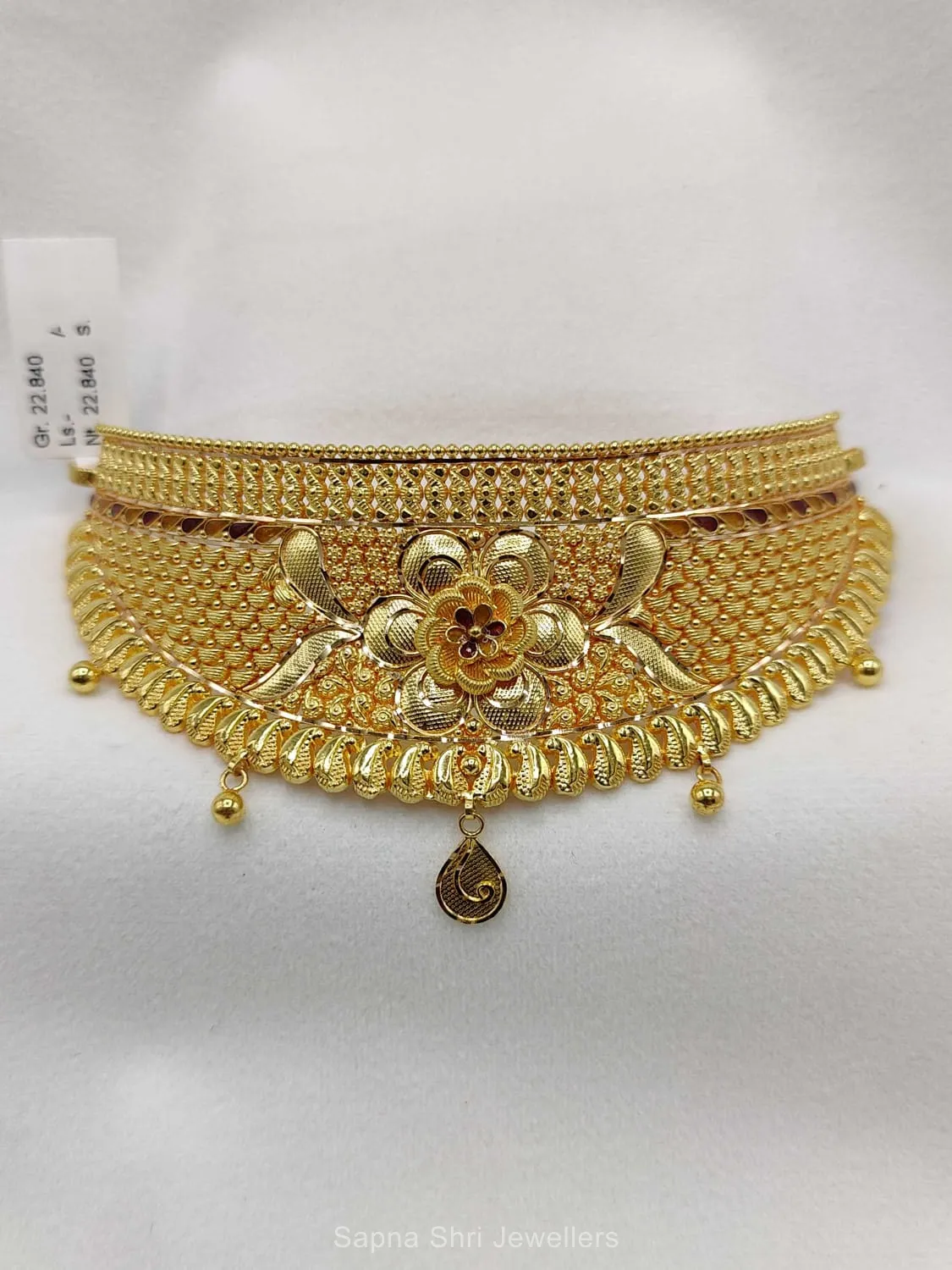 BIS HallmarkThis exquisite choker combines a structured mesh base with a blooming floral centerpiece. Detailed gold beadwork ensures a luxurious feel for grand festive celebrations and weddings.