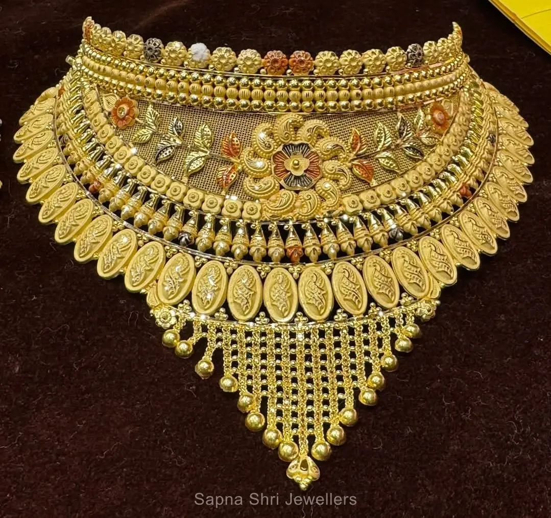 BIS HallmarkA broad bridal choker featuring antique coin motifs and vibrant Meenakari floral touches. The hanging bead fringe adds a dramatic touch.