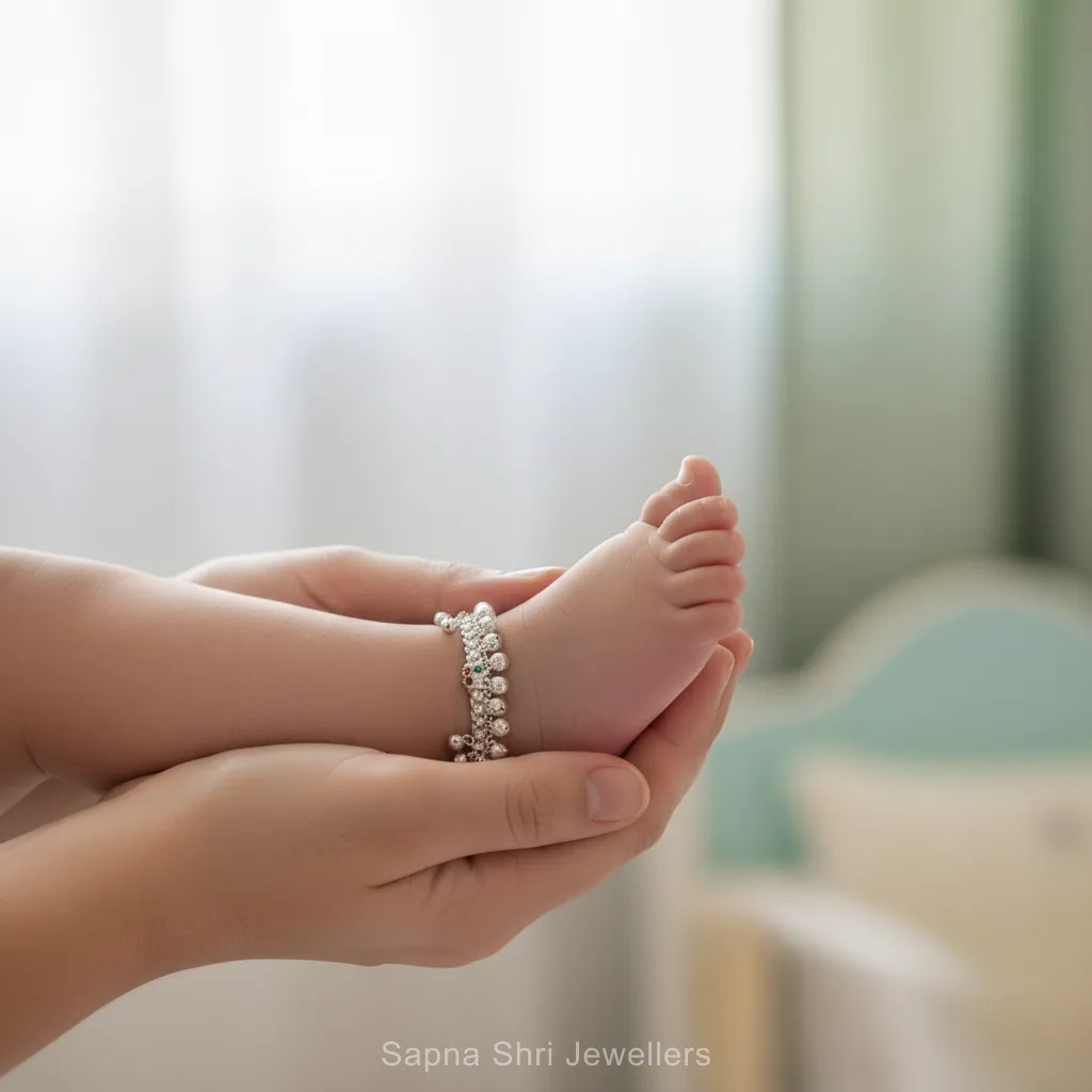 BIS HallmarkThis timeless piece focuses on the purity of 925 silver, featuring a dense cluster of bells that create a joyful sound with every kick. It is the quintessential Indian baby jewelry piece, blending heritage with high-end luxury. Ideal for daily wear to keep the house filled with happy sounds.