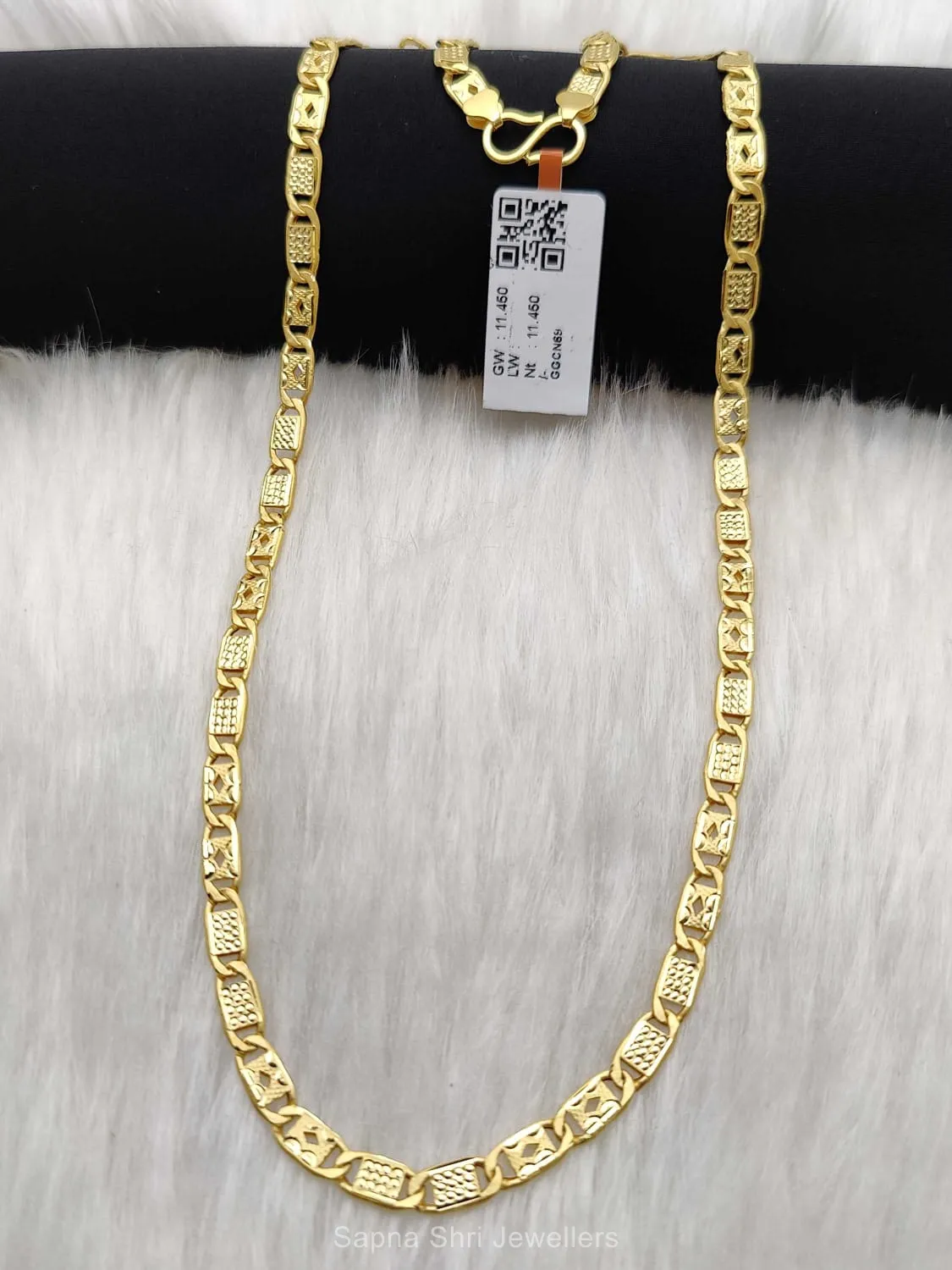 BIS HallmarkA bold gold chain featuring embossed rectangular links with textured patterns. This piece showcases heavy-duty craftsmanship and a lustrous finish, making it a timeless investment in style.