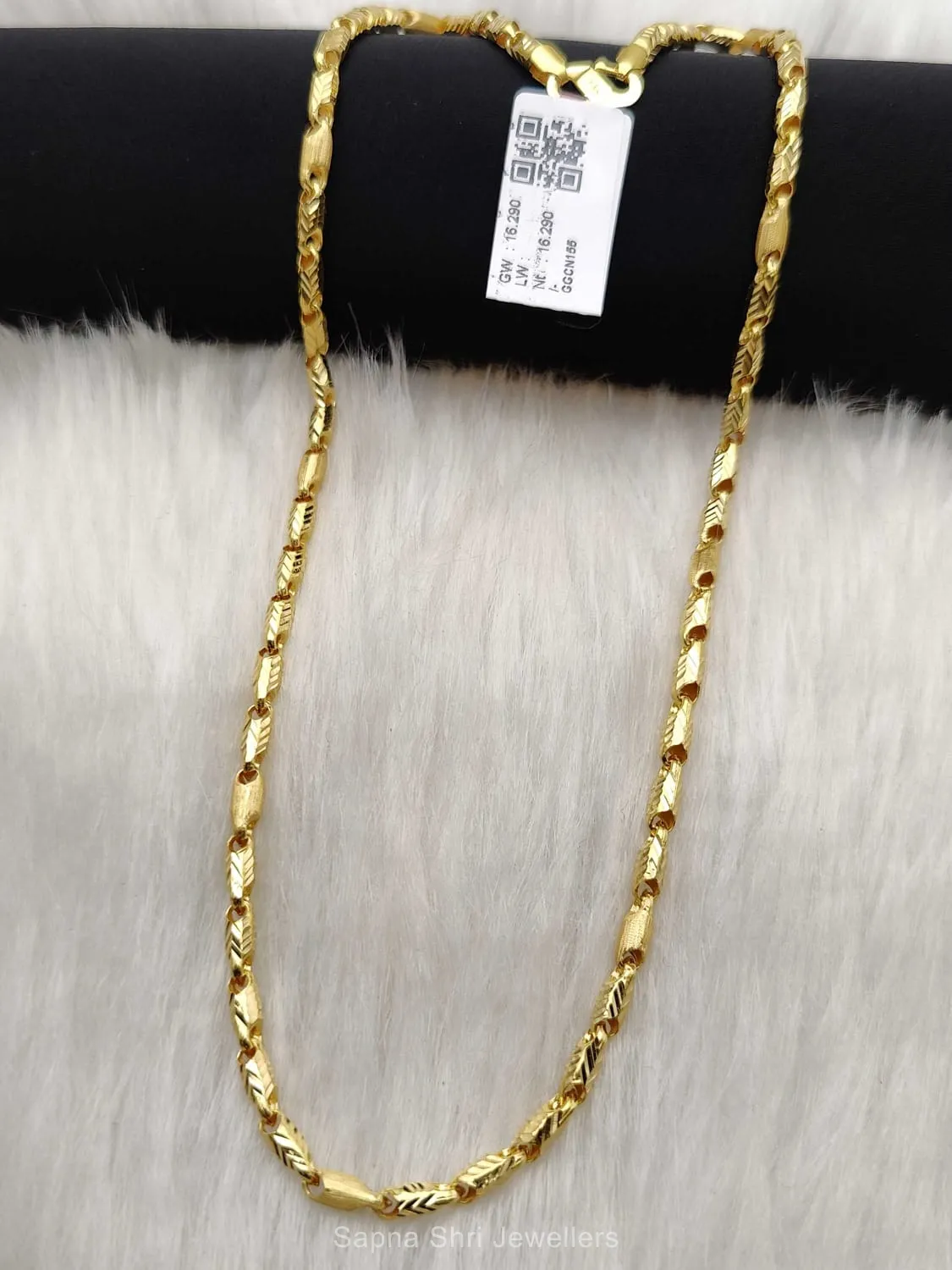 BIS HallmarkFeaturing unique spindle-shaped links with sharp textured carvings, this gold chain offers a modern twist on classic Indian gold ornaments.