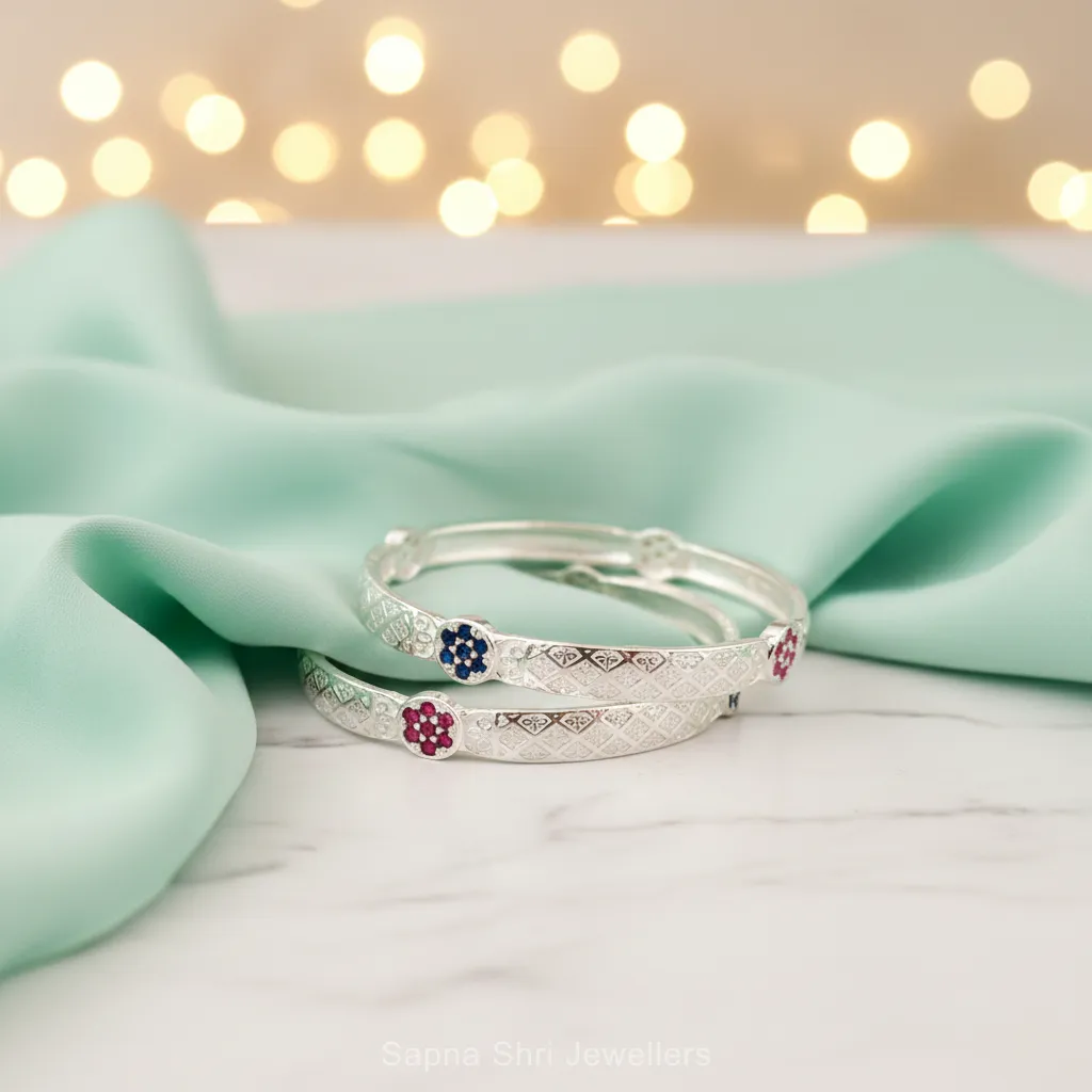 BIS HallmarkFeaturing delicate blue and pink floral motifs, these engraved bangles are a testament to fine craftsmanship for tiny humans. The textured silver surface catches the light beautifully, making it a perfect accessory for festive occasions or family portraits. It’s a piece of jewelry she will cherish as her first "big girl" accessory.