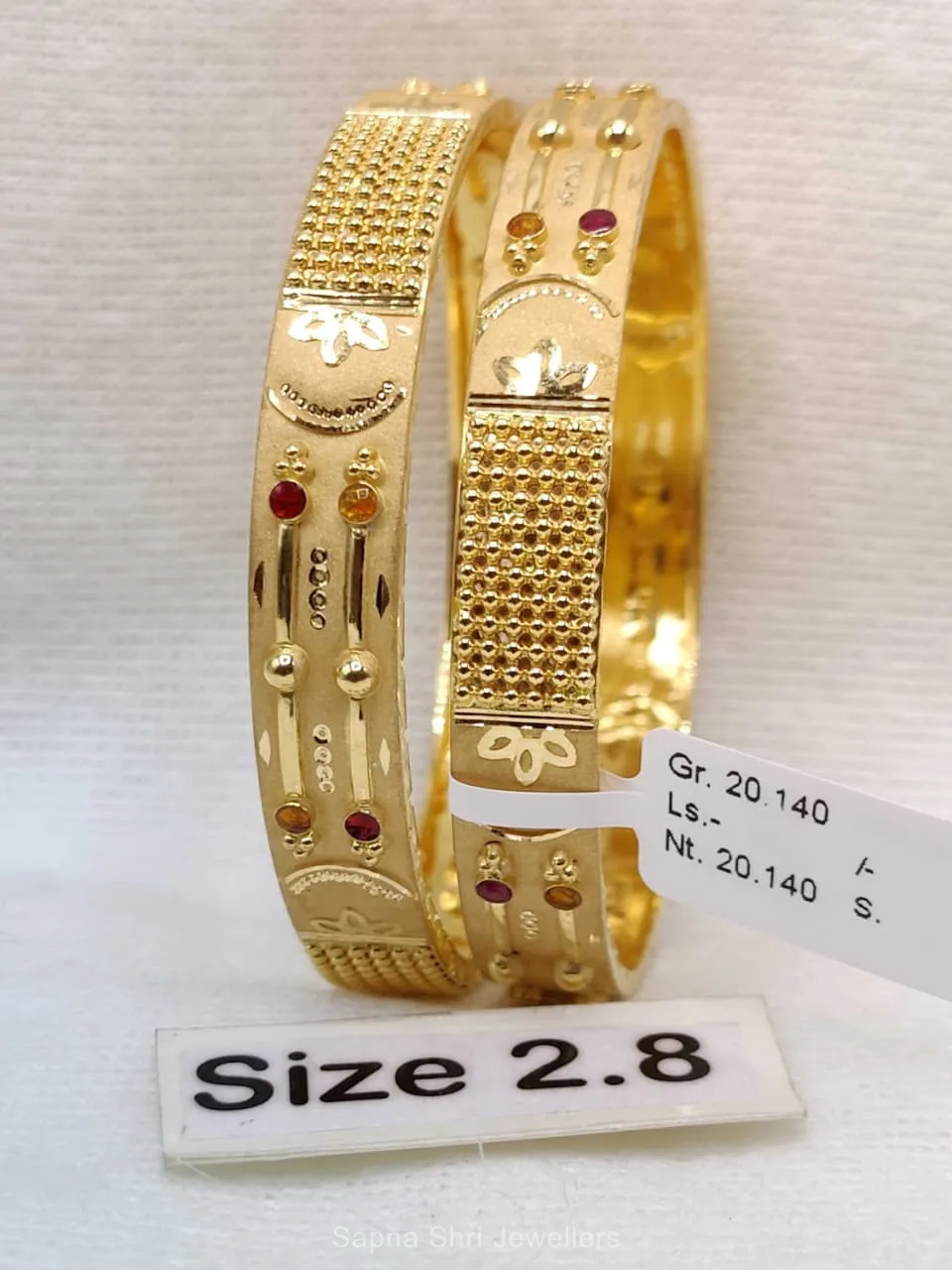 BIS HallmarkThese royal kangan feature a refined matte gold finish contrasted with polished beadwork and colorful stone drops. An essential addition for a grand and regal jewelry collection.