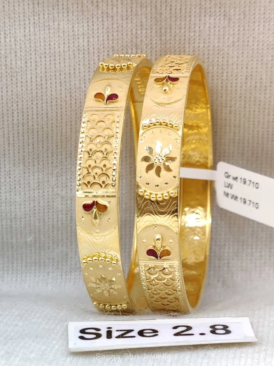 BIS HallmarkDesigned with a unique scalloped pattern and central floral motifs, these bangles offer a graceful silhouette. The fine detailing reflects traditional Indian festive aesthetics.