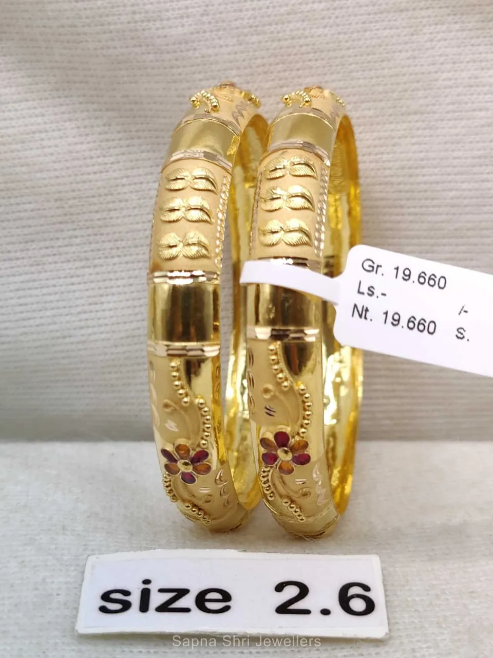 BIS HallmarkGraceful gold bangles featuring a continuous leafy vine motif and delicate floral enamel. A harmonious blend of nature-inspired art and premium gold finish.