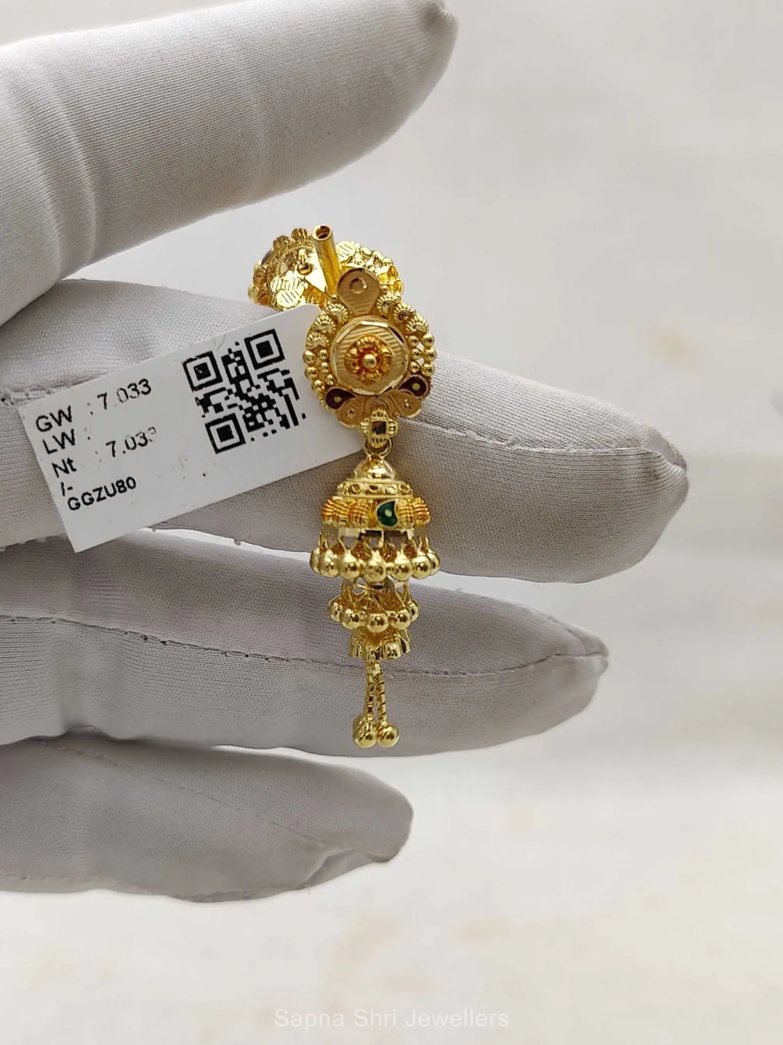 BIS HallmarkThese dainty gold jhumkas feature light, layered drops and fine filigree, offering a delicate yet festive look that is perfect for bridesmaids and family functions.