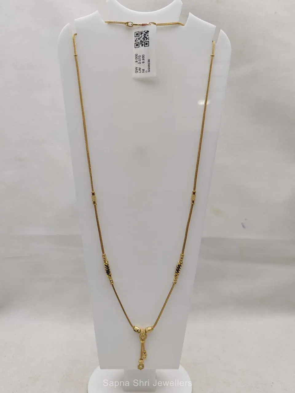 BIS HallmarkA sophisticated gold mangalsutra featuring a refined sleek chain design and a delicate pendant, epitomizing traditional grace and expert craftsmanship for the modern woman.