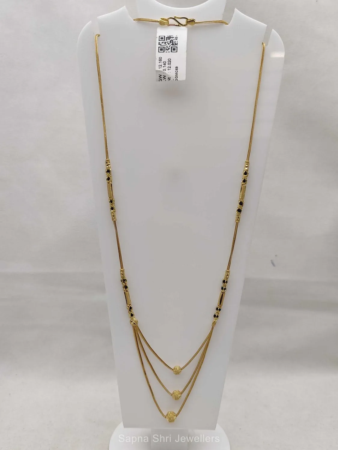 BIS HallmarkFeaturing a unique three-tier layered chain and intricate gold droplets, this mangalsutra is a masterpiece of design, offering a bold yet elegant look for special occasions.