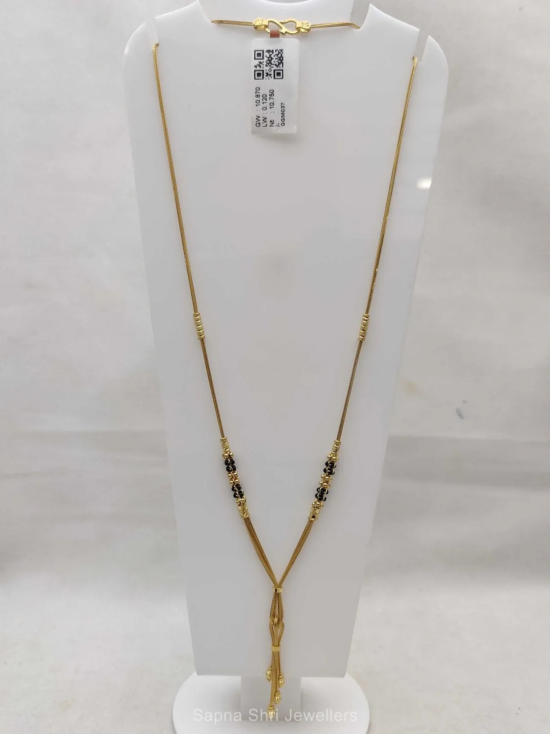 BIS HallmarkA beautiful gold mangalsutra featuring traditional black beads and a graceful tassel-style drop pendant, offering a rhythmic and elegant movement to the design.