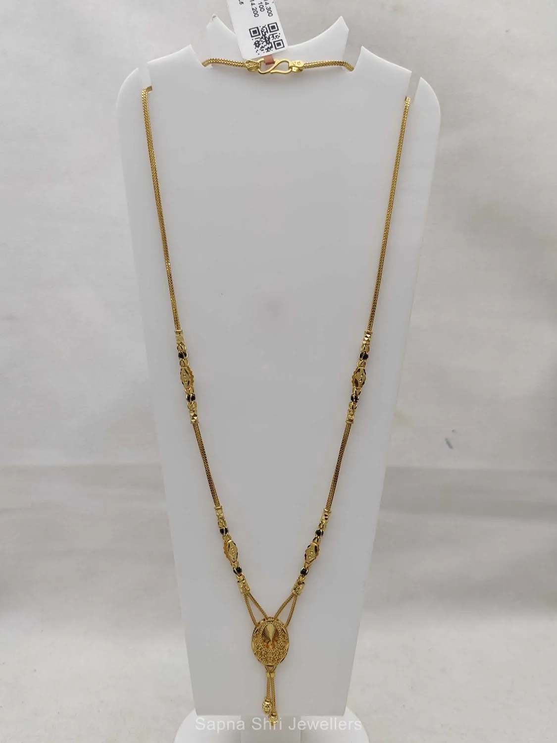 BIS HallmarkA bold and innovative take on the traditional mangalsutra, this design features double barrel-style gold elements, offering a substantial look without compromising on intricate detail.