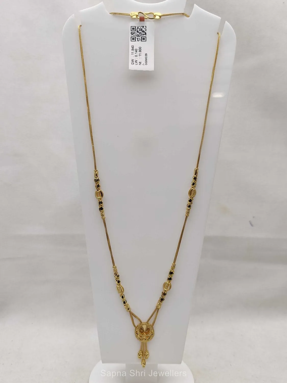 BIS HallmarkElegance meets tradition in this gold mangalsutra featuring a medallion-style pendant and rhythmic bead patterns, crafted for those who appreciate the finer details of Indian art.