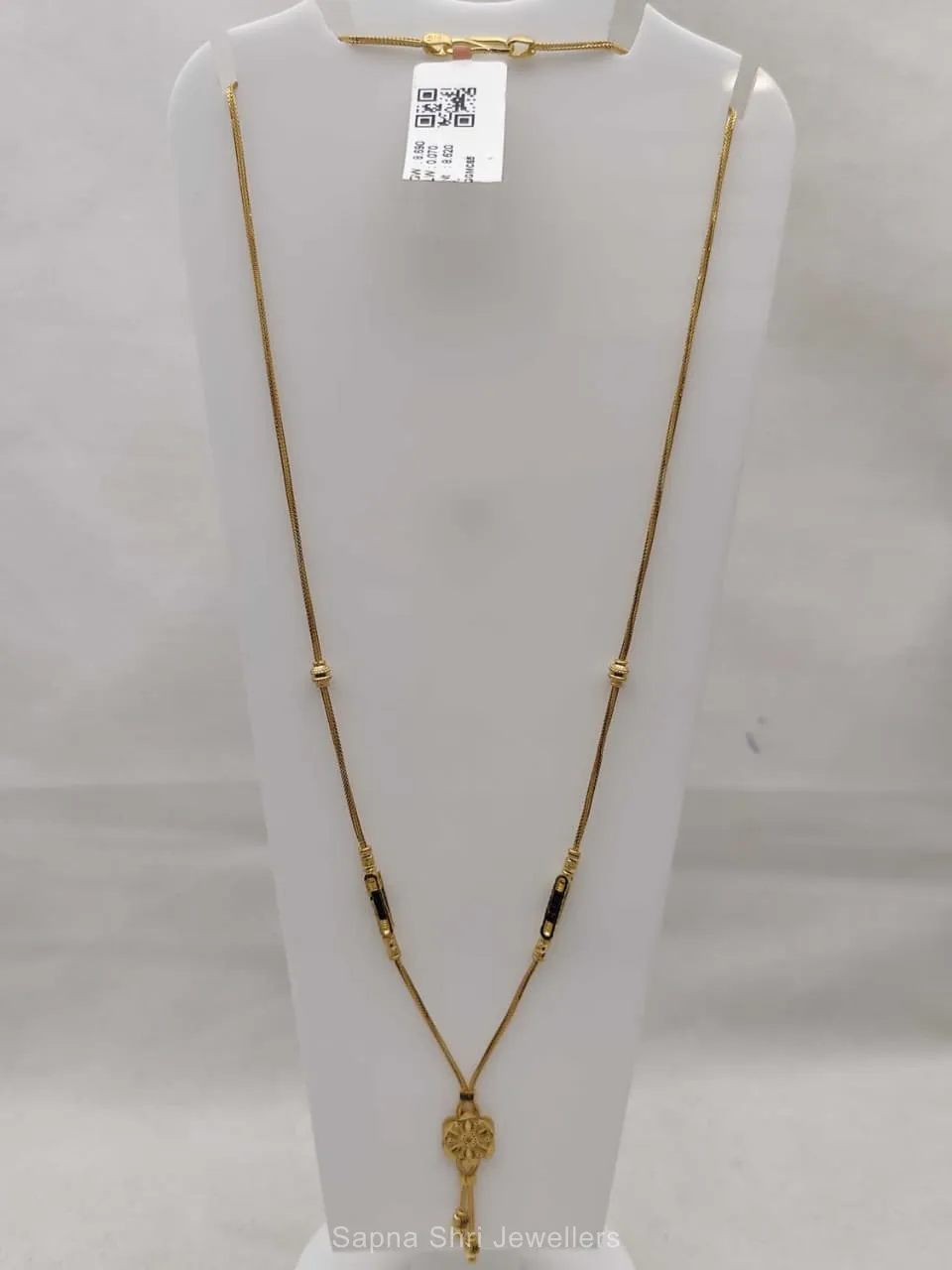 BIS HallmarkShowcasing a stunning floral central motif, this gold mangalsutra chain reflects superior artisanal skill, making it an essential heirloom piece for celebrating marital harmony and style.