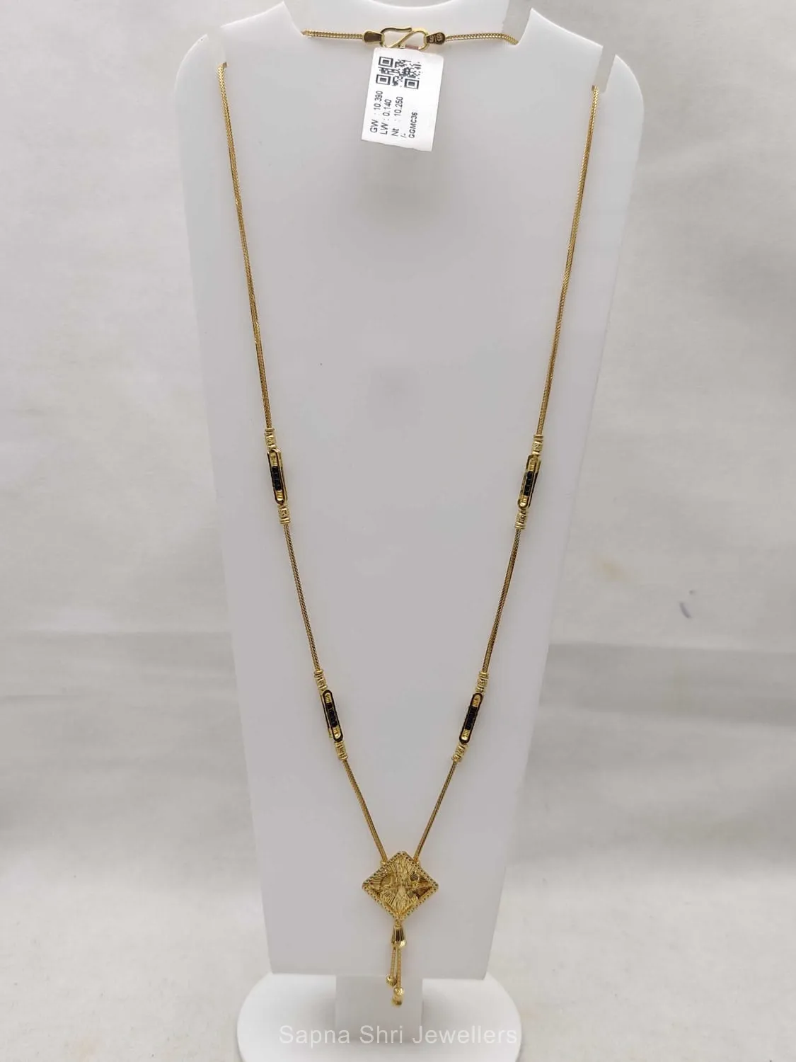BIS HallmarkThis premium mangalsutra features a bold diamond-shaped pendant with intricate gold filigree work. A masterpiece of Indian craftsmanship that balances traditional weight with modern style.