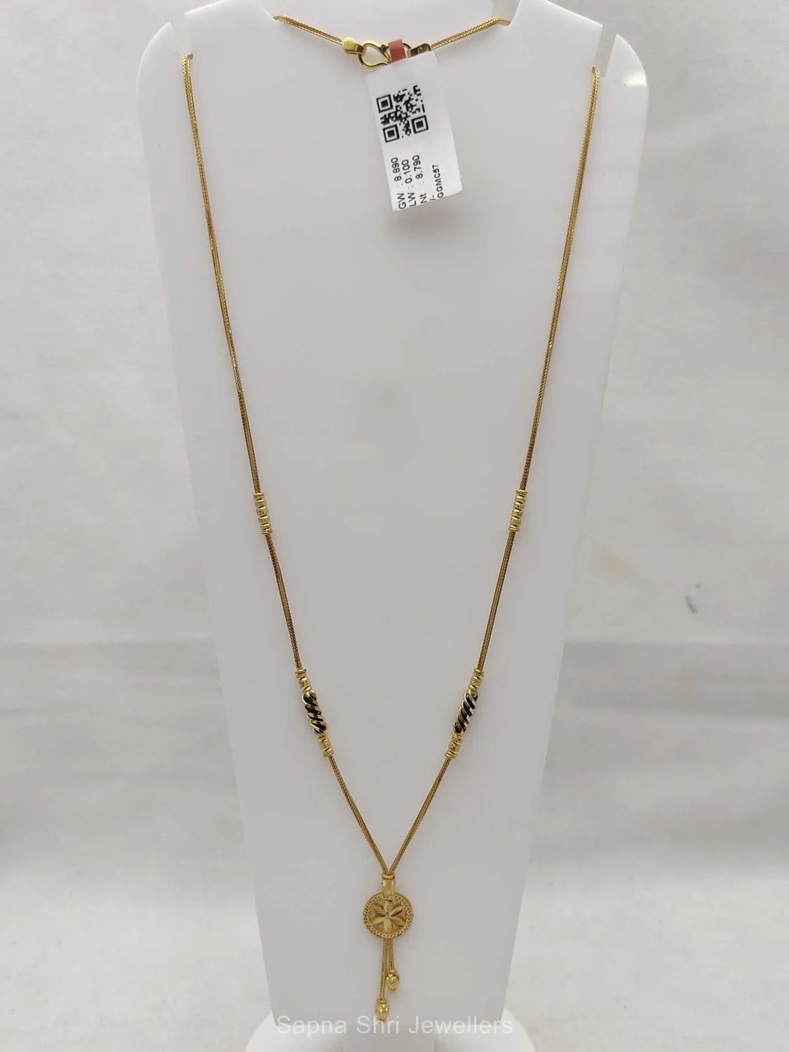 BIS HallmarkA delicate circular pendant with floret engraving serves as the focal point of this elegant mangalsutra, balanced by gold tube stations and traditional black beadwork.
