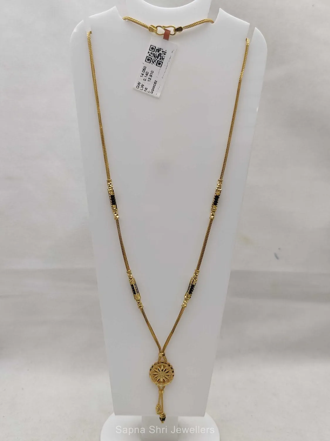 BIS HallmarkDetailed with a solar-inspired circular pendant and elongated gold stations, this mangalsutra offers a bold and majestic presence, perfect for celebrating lasting bonds.