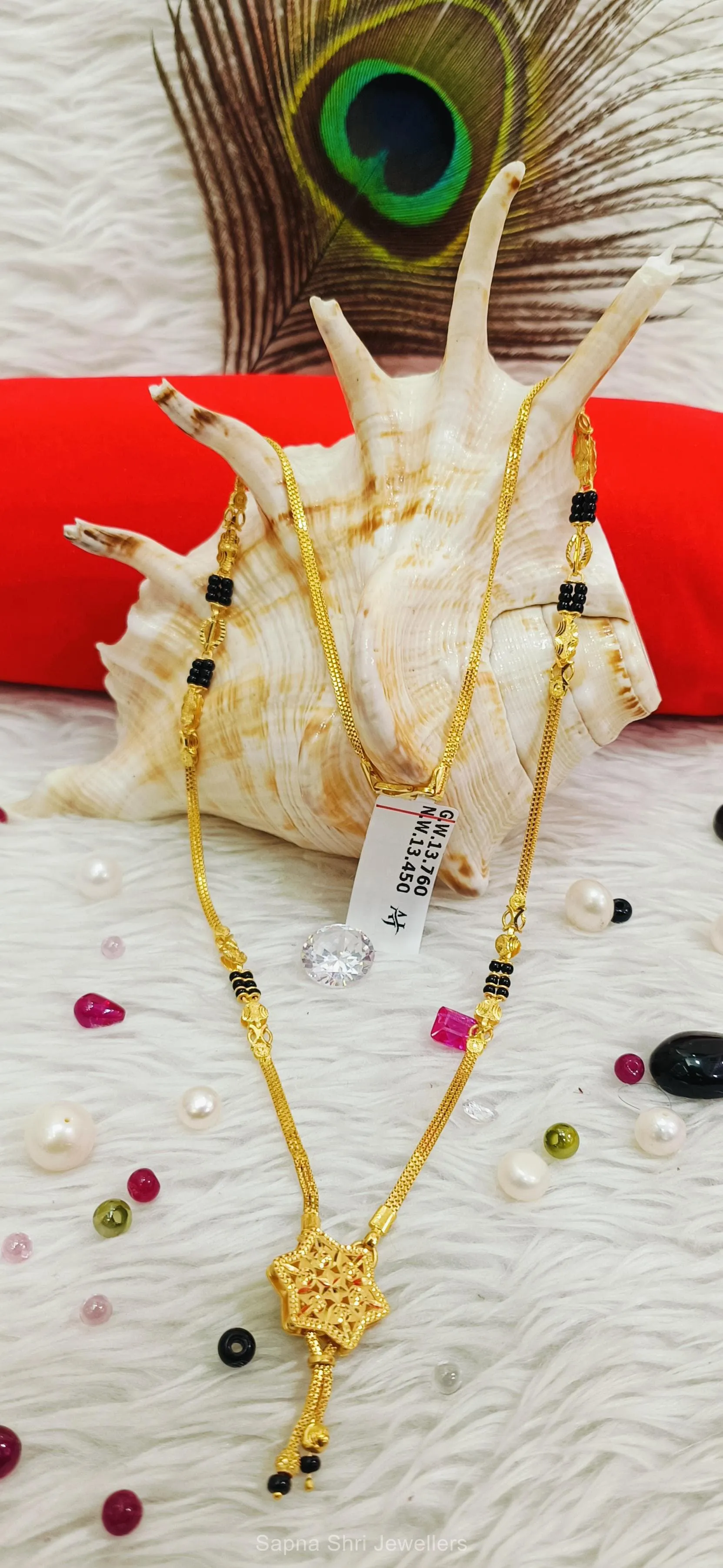 BIS HallmarkA celestial-inspired mangalsutra featuring a star-shaped pendant with intricate gold mesh work. This premium piece brings a touch of modern brilliance to traditional Indian bridal wear.