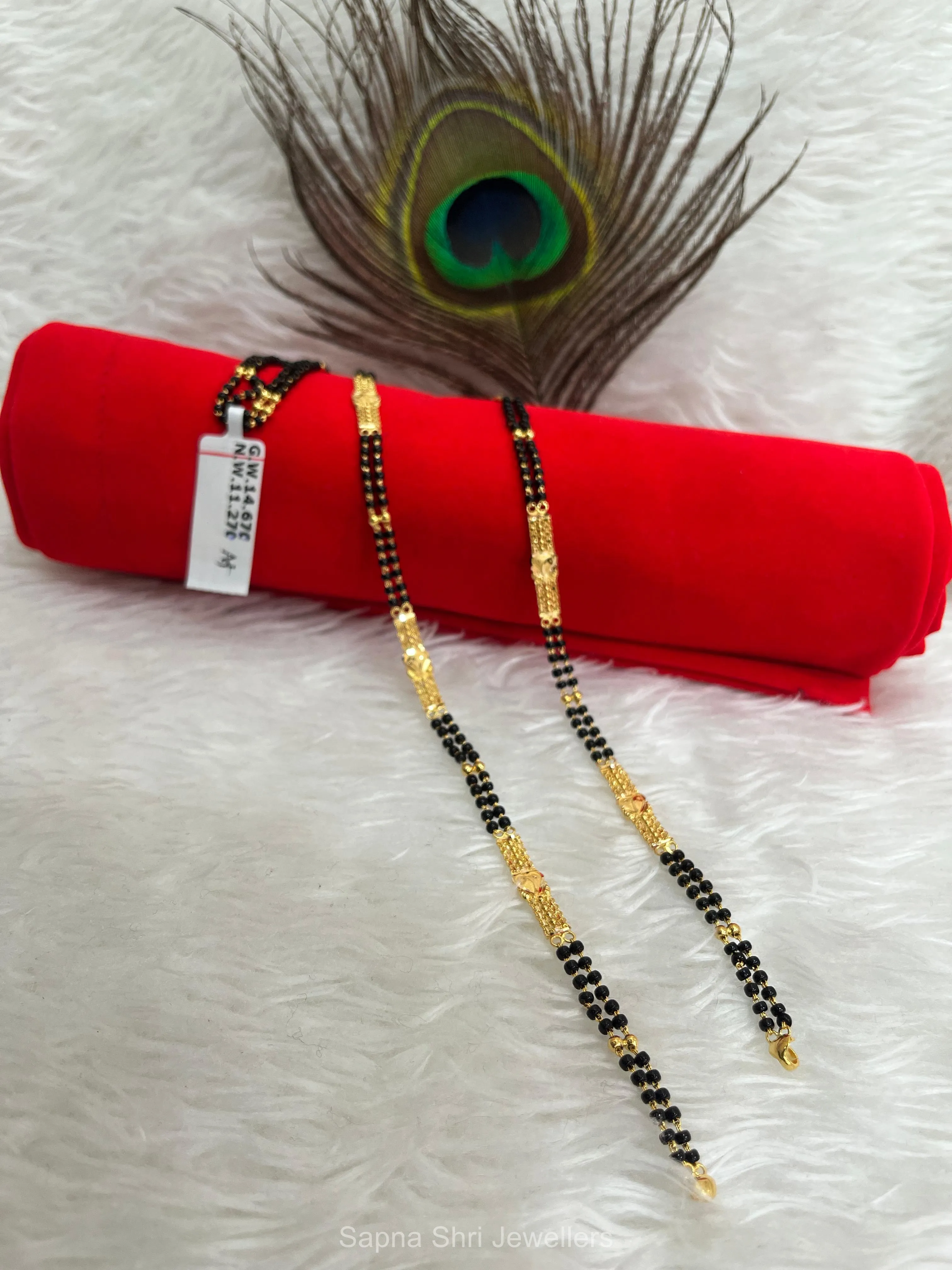 BIS HallmarkA sophisticated mangalsutra chain featuring alternating black beads and ornate gold cylinders. Designed for versatility and grace, it reflects the heritage of classic Indian jewelry styles.