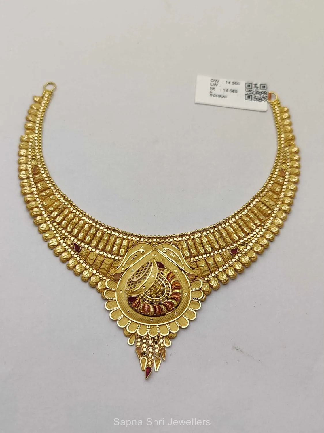 BIS HallmarkElevate your style with this gold haar boasting a striking triangular medallion and rhythmic gold patterns, designed for the modern woman who loves tradition.