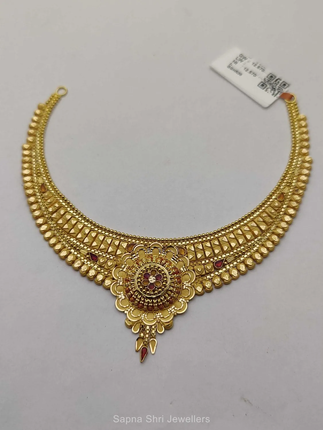 BIS HallmarkA stunning gold necklace featuring a perfectly symmetrical floral mandala. Each petal is meticulously crafted to reflect light and celebrate Indian artistic traditions.