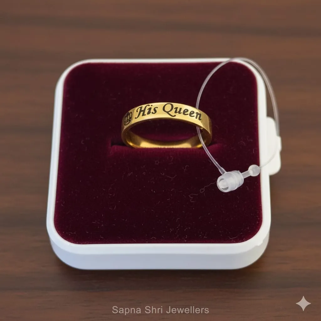 • यह एक स्टाइलिश गोल्ड-टोन बैंड रिंग है, जिस पर "His Queen" और एक मुकुट का चिन्ह काले रंग से उकेरा गया है। इसे एक शानदार काले मखमल के ज्वेलरी बॉक्स में रखा गया है, जो इसे एक बेहतरीन रोमांटिक उपहार बनाता है।