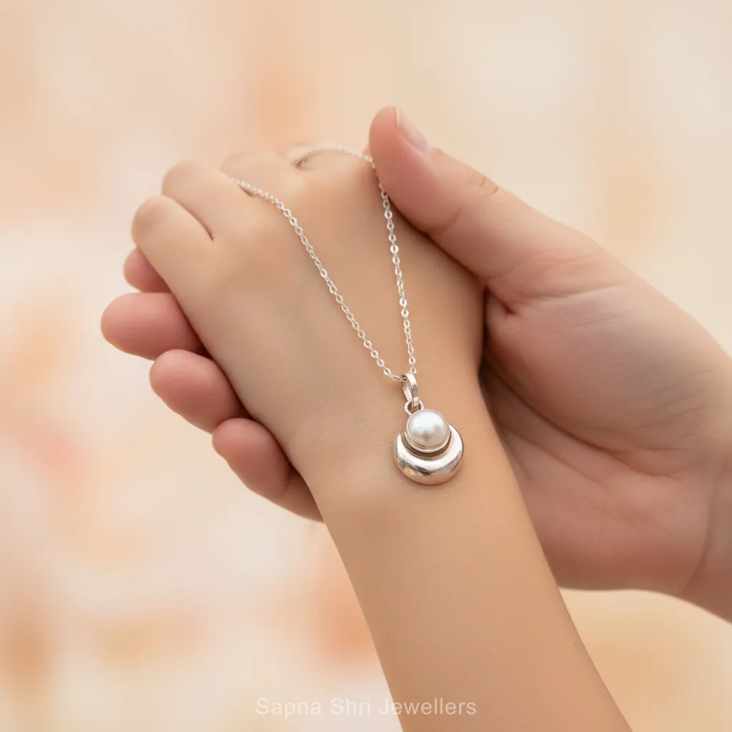 BIS HallmarkCrafted in premium 925 silver, this serene pearl pendant mirrors the purity of a child’s soul and the calming presence of the moon. It is the ideal accessory for daily wear or a naming ceremony, providing a gentle sparkle that complements any outfit. This piece isn't just jewellery; it’s a tiny charm of protection and grace for your little one.