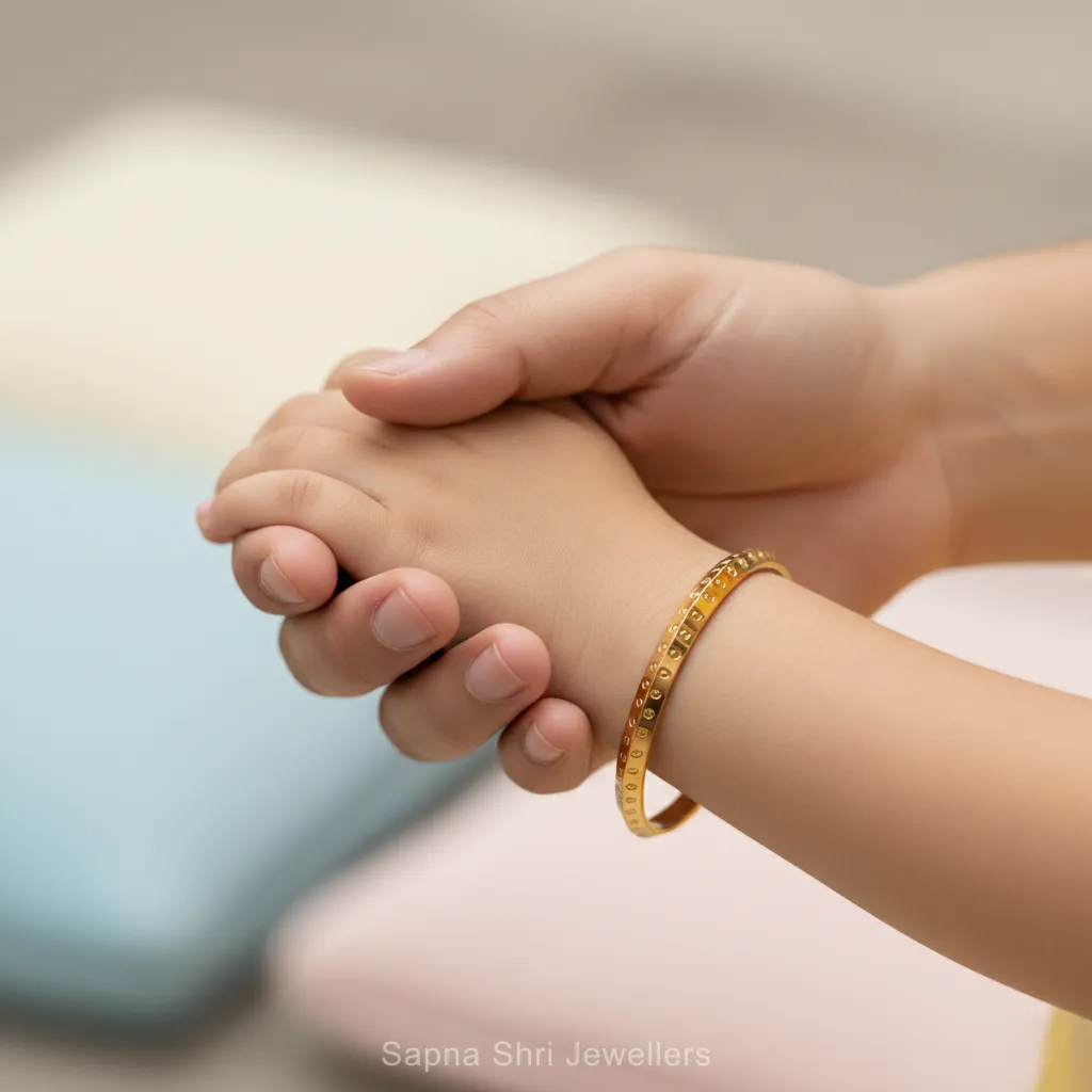 BIS HallmarkThis kada features a brilliant, mirror-like gold finish on a 925 silver base, offering the prestige of gold with the skin-friendly benefits of silver. Its minimalist design makes it versatile for any occasion, from casual playdates to formal family events. A timeless piece that grows with your child’s style and becomes a cherished memory of their early years.