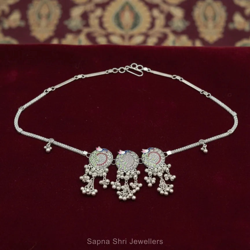 Traditional full silver Kamar Kandora (waist belt) with fine Meenakari work and ghungroo; a grand and colorful accessory for weddings.