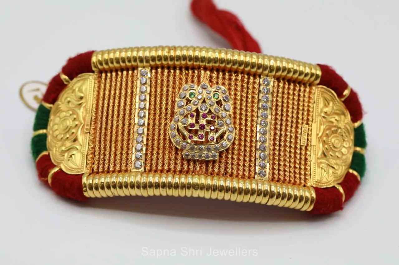 BIS HallmarkFeaturing a sacred Swastik central motif, this Bajuband combines spiritual symbolism with opulent gold craftsmanship. Adorned with multi-color stones for a vibrant bridal appeal.