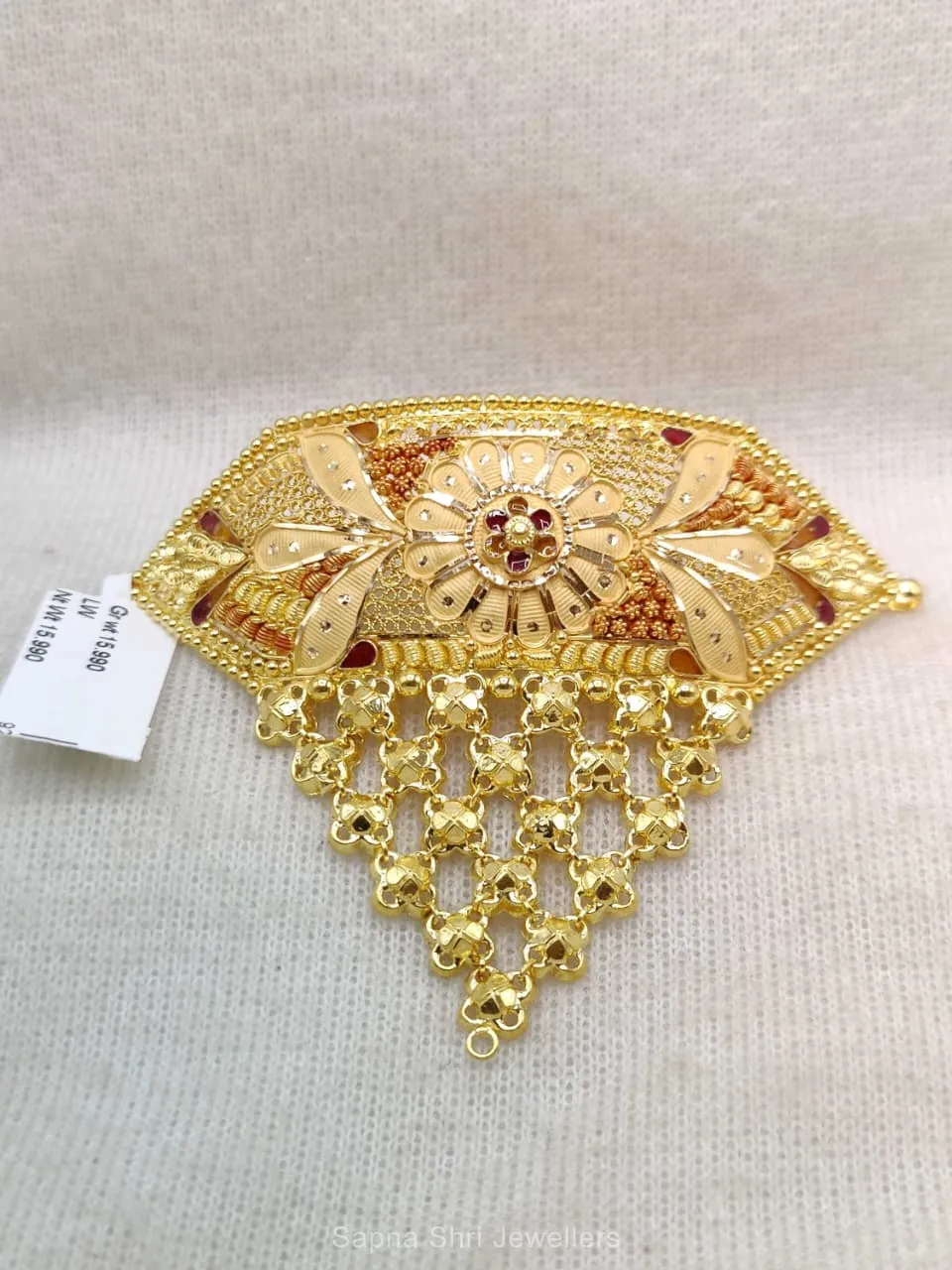 BIS HallmarkRadiate elegance with this sunray inspired gold armlet. Featuring fine laser-cut filigree and a cascading golden mesh, it represents the height of luxury in Indian bridal accessories.
