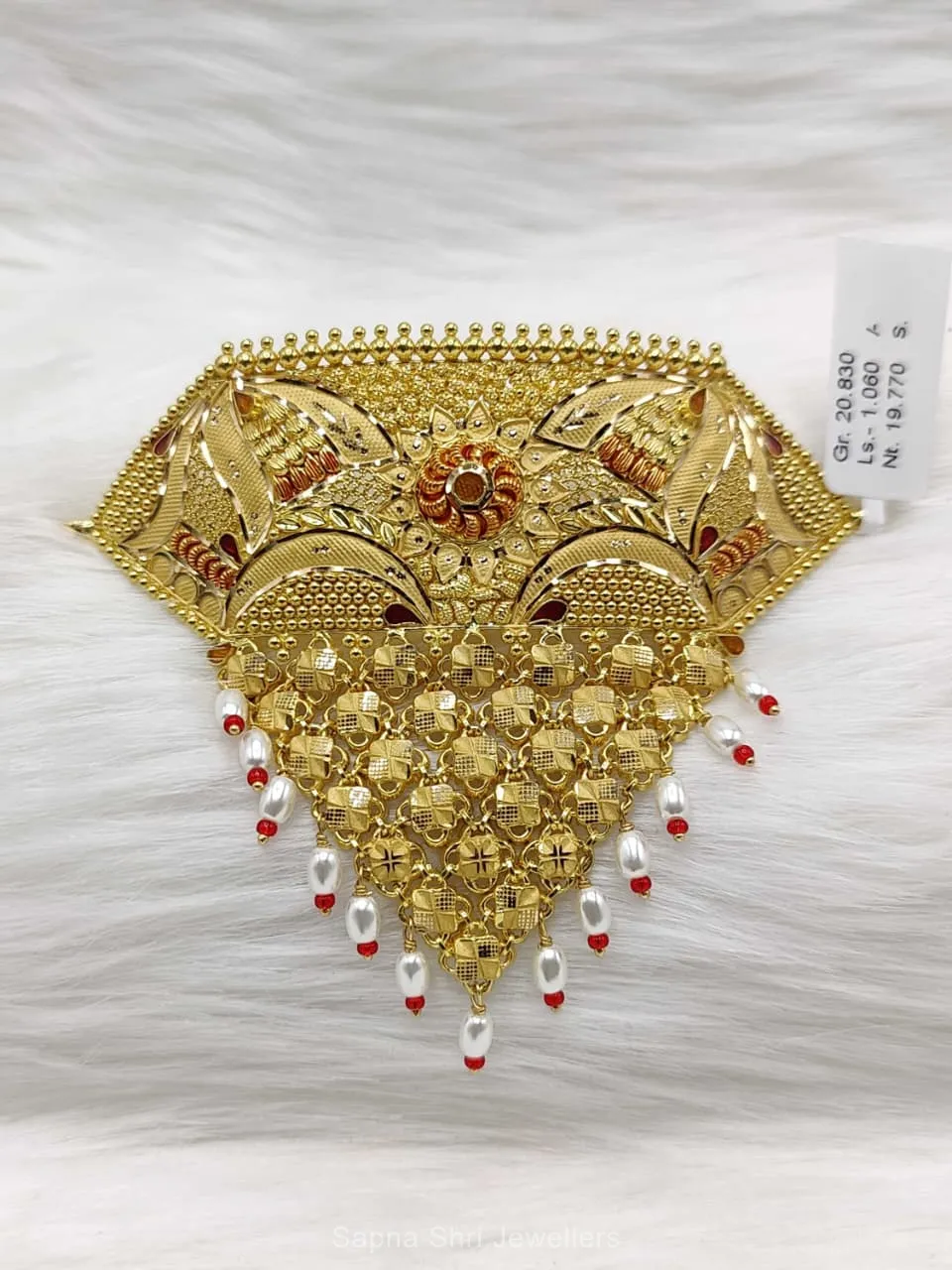 BIS HallmarkOrnate gold Baju Band featuring layered textures and hanging pearl droplets with red bead accents. This piece offers a grand look for weddings, showcasing impeccable detailing.