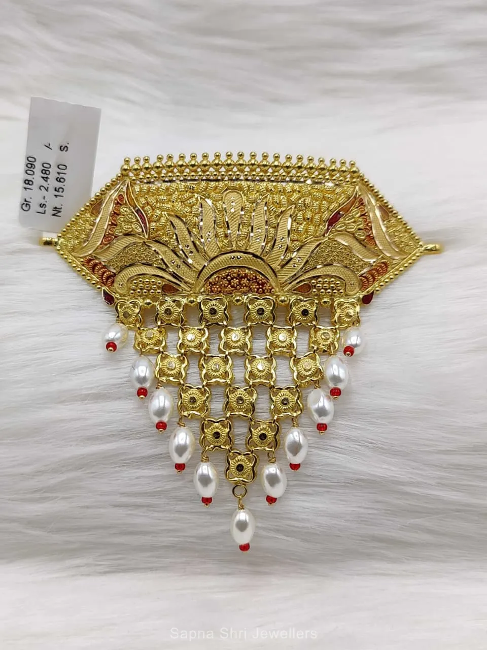 BIS HallmarkCapturing the majesty of a sun-burst, this choker features radiating gold patterns and graceful pearl drops. A symbol of luxury and traditional Indian grace.