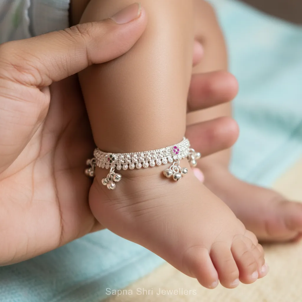 BIS HallmarkBlending the tradition of 'Nazariya' with the luxury of 925 silver, these anklets feature delicate ruby-colored stones and tiny bells. They are crafted to protect your baby’s aura while looking absolutely adorable with any ethnic outfit. A thoughtful gift for a newborn's first homecoming.