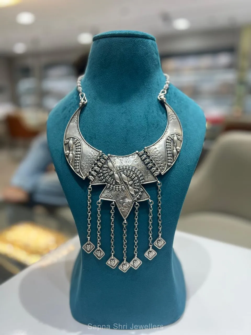 Embrace ethnic grace with this large crescent-shaped silver necklace, adorned with detailed embossing and delicate square fringes that create a rhythmic movement for the wearer.