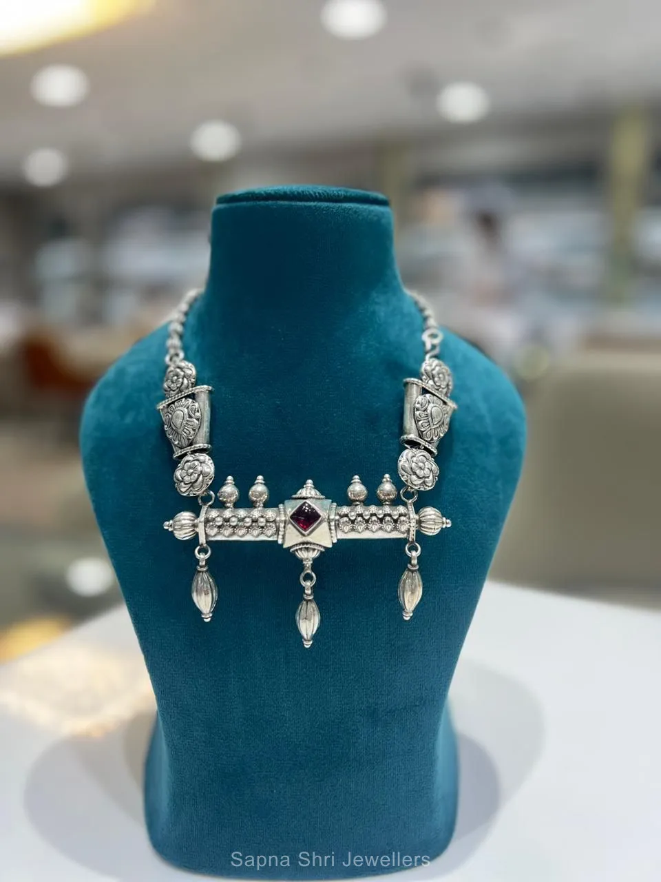 A masterpiece of silver craftsmanship, this necklace features a striking ruby centerpiece and cylindrical motifs, reflecting the timeless heritage of royal Indian jewelry designs.