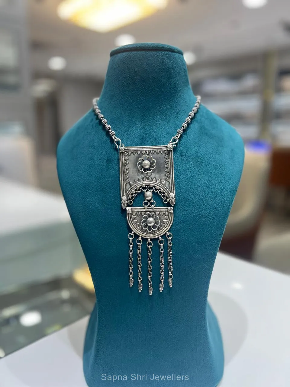 A unique two-part pendant design featuring a rectangular top and semi-circular base, both intricately engraved with floral motifs and long, elegant chain tassels.