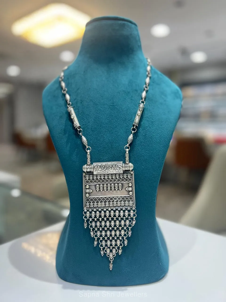 A masterpiece of traditional design, this necklace boasts a large lattice-work pendant with intricate mesh detailing and a heavy multi-layered beaded fringe.