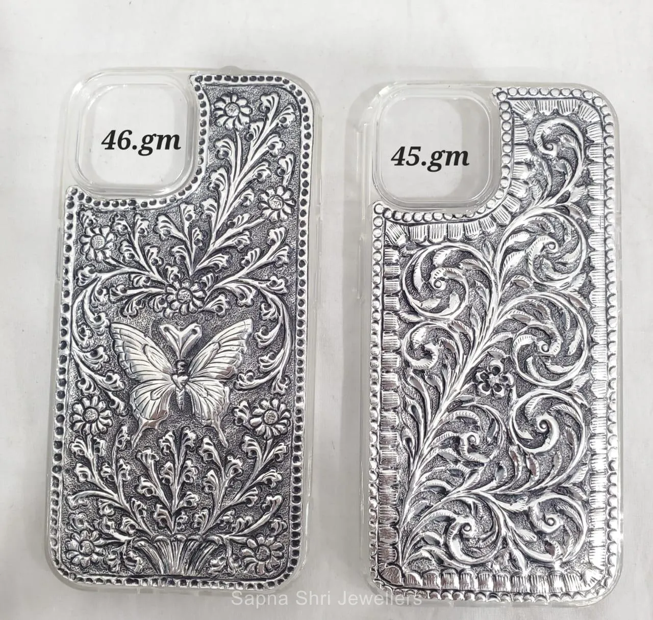Elevate your daily accessory with these exquisite silver-plated phone covers, featuring deeply embossed butterfly and floral patterns for a touch of personalized luxury.