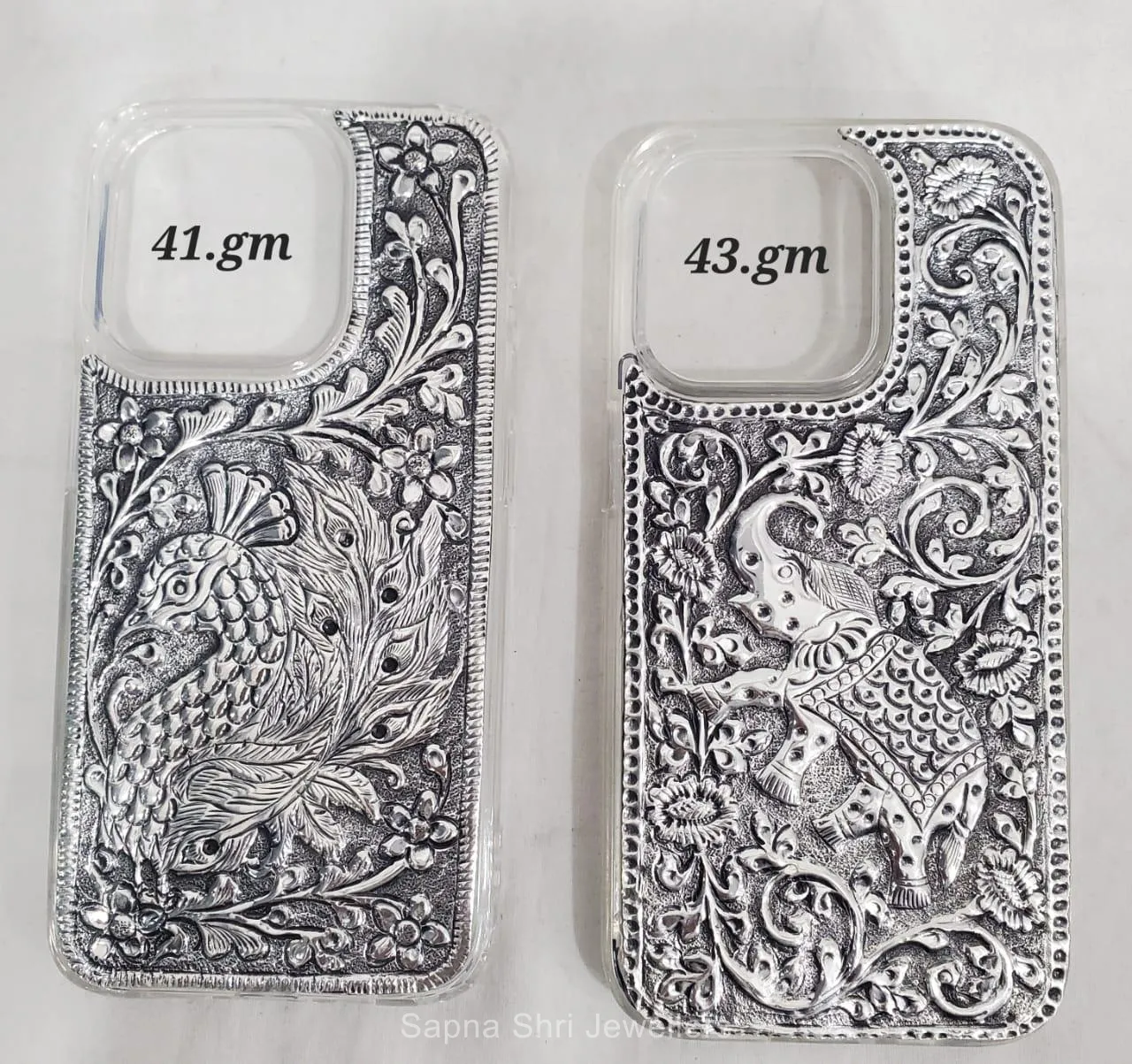 Exquisite silver-plated iPhone cases featuring intricate peacock and elephant motifs. Expertly handcrafted for a premium feel that blends traditional Indian art with modern luxury.